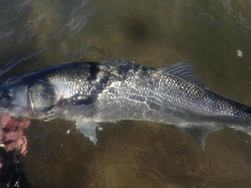 The second,third and fourth fish either smashed the lure or rolled it , but no solid hook up. But the fifth fish was my chance to redeem the one that got away. As I was finishing the retrieve on a asture 110 I had a good fish hit and hit it hard, no messing about, this fish was on and the fight was on .All I needed was the hooks to hold. Splashes of the tail and runs back and forth the battle was all close in, my main concern was making sure the leader didn’t rub on its gill plate.At last she was in the net, a beautifull 71 cm fish and a sense of relief for finally catching one ! Bass 4 Joel 1 !!..